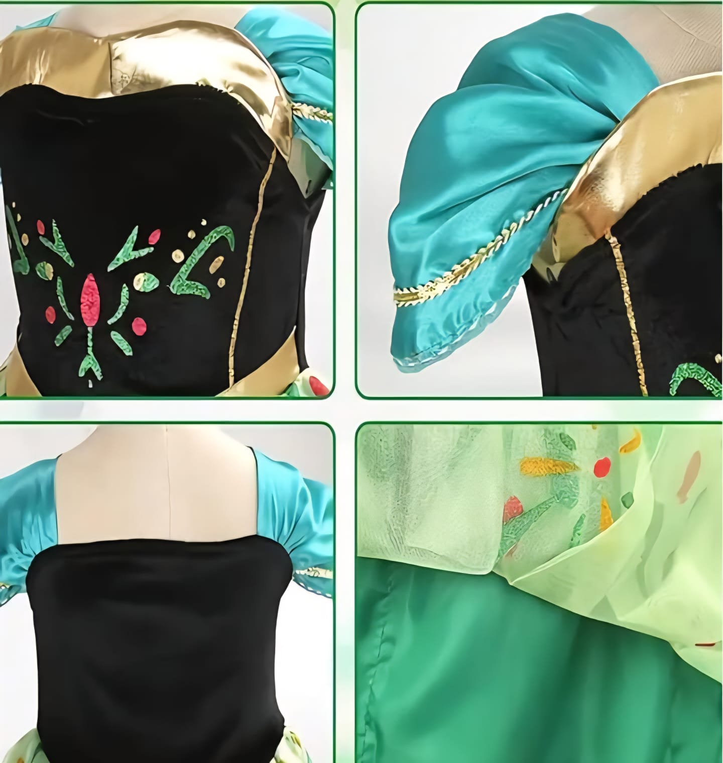 Colores: Negro, turquesa, dorado y detalles multicolor.